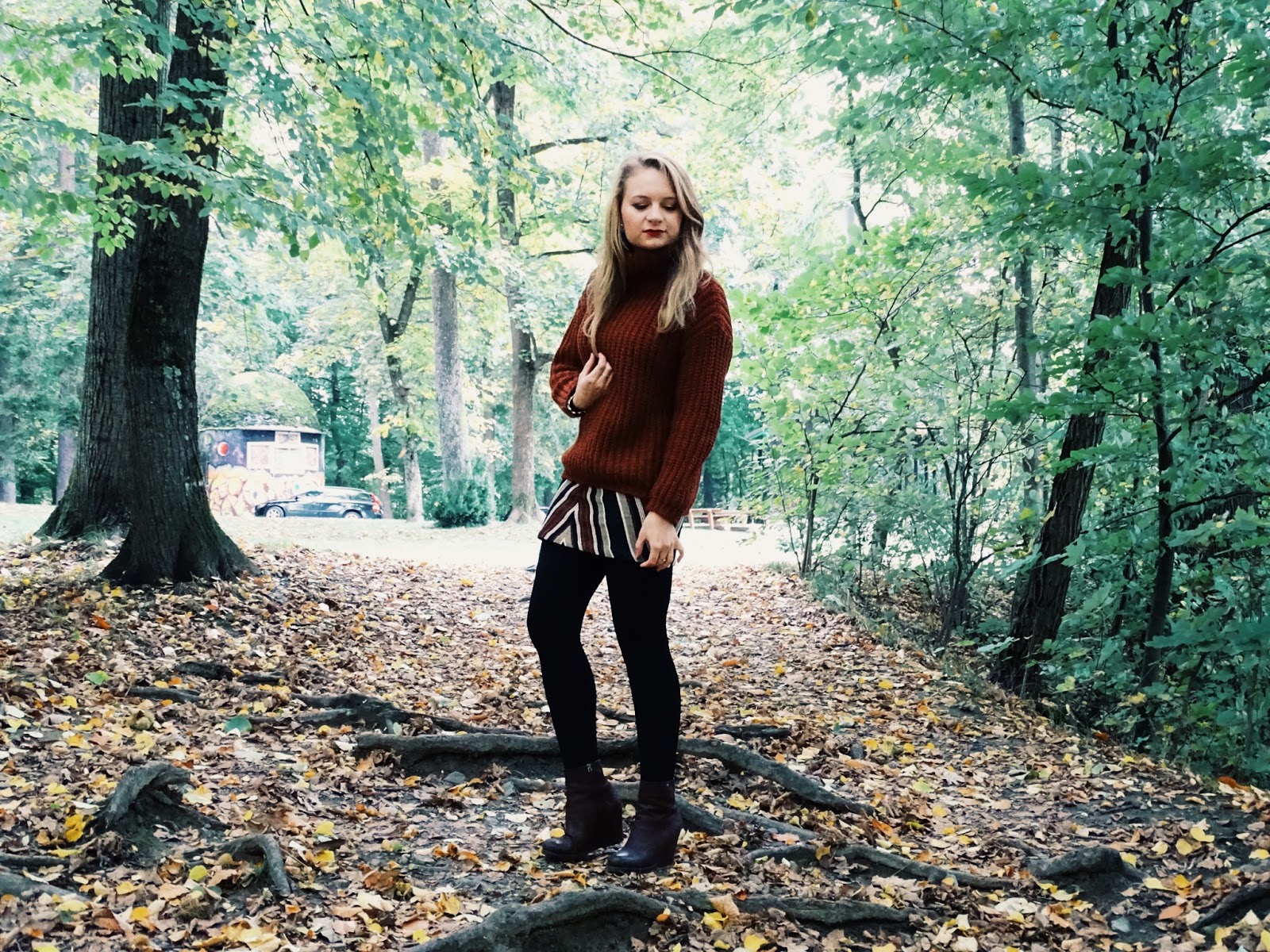 Autumn is undoubtedly my favourite time of the year as you can start wearing cozy sweaters and enjoy the advantages of layering again. Moreover, I have always had a slight obsession for the atmosphere that is created by the leaves changing colours and turning world’s forests into a picturesque image of nature set on fire. Autumn is a season full of change and preparation for the time of nature’s hibernation and I have found myself opting for outfits in autumn colours a majority of the time during this particular season. Earth tones radiate a high amount of peacefulness and make me personally feel more grounded and settled, which results in me feeling more confident with myself. Those colours are easy to combine as there are loads of shades that not only nature but also fashion provides so it’s basically suitable for every kind of skin tone and hair colour. Especially sweaters in natural colours made of a soft, comfortable fabric like gentle wool or silk, the choice depends on temperature and preference only, are perfect to be combined with more extraordinary patterns to create an individual outfit that makes you stand out.