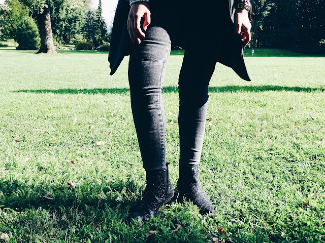 As I have always had a slight obsession for unique patterns and exceptional designs I immediately fell in love with Zara’s new, black, glittery Chelsea boots which add a bit of glamour to every grey-blackish autumn outfit and are best to wear with restrained pieces as they are definitely meant to be an outfit’s highlight. I combined them with a cape-shaped, dark grey coat that is perfect for chilly autumn days and comes with detachable, black faux fur details at the collar.