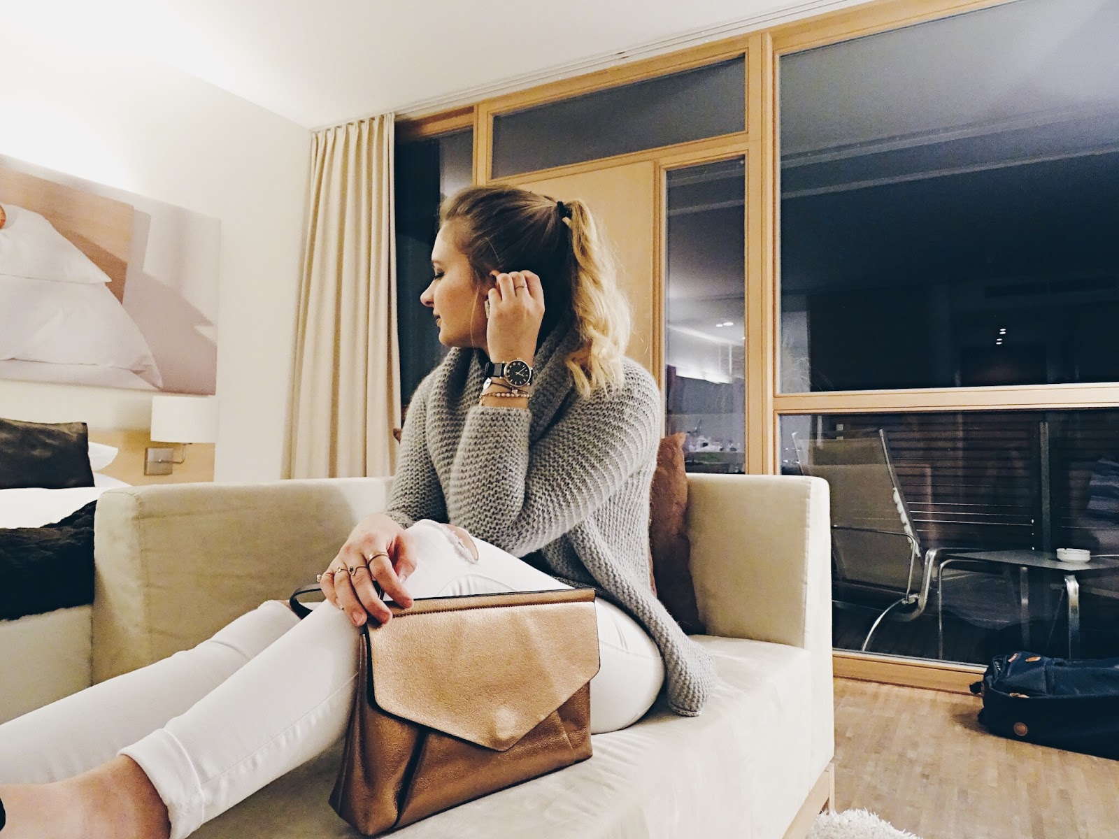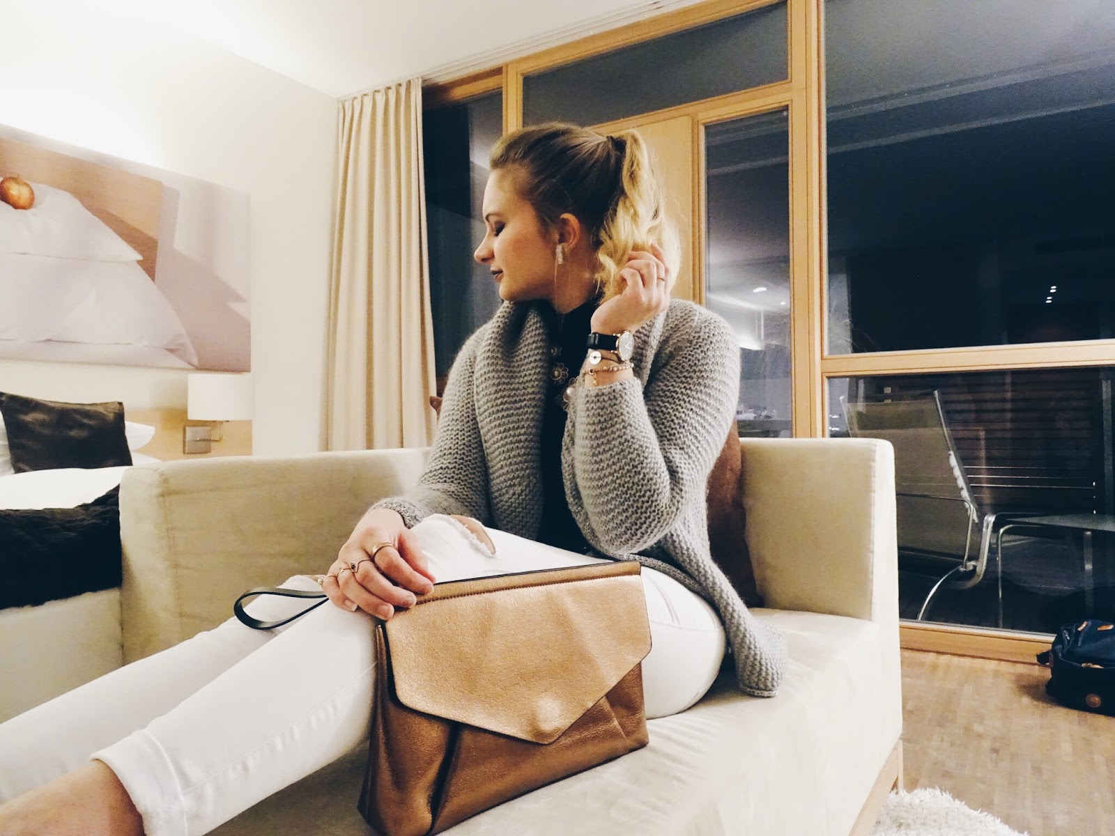 Cardigan: Rich & Royal, Turtleneck: H&M; Jeans: Only; Clutch: Zara