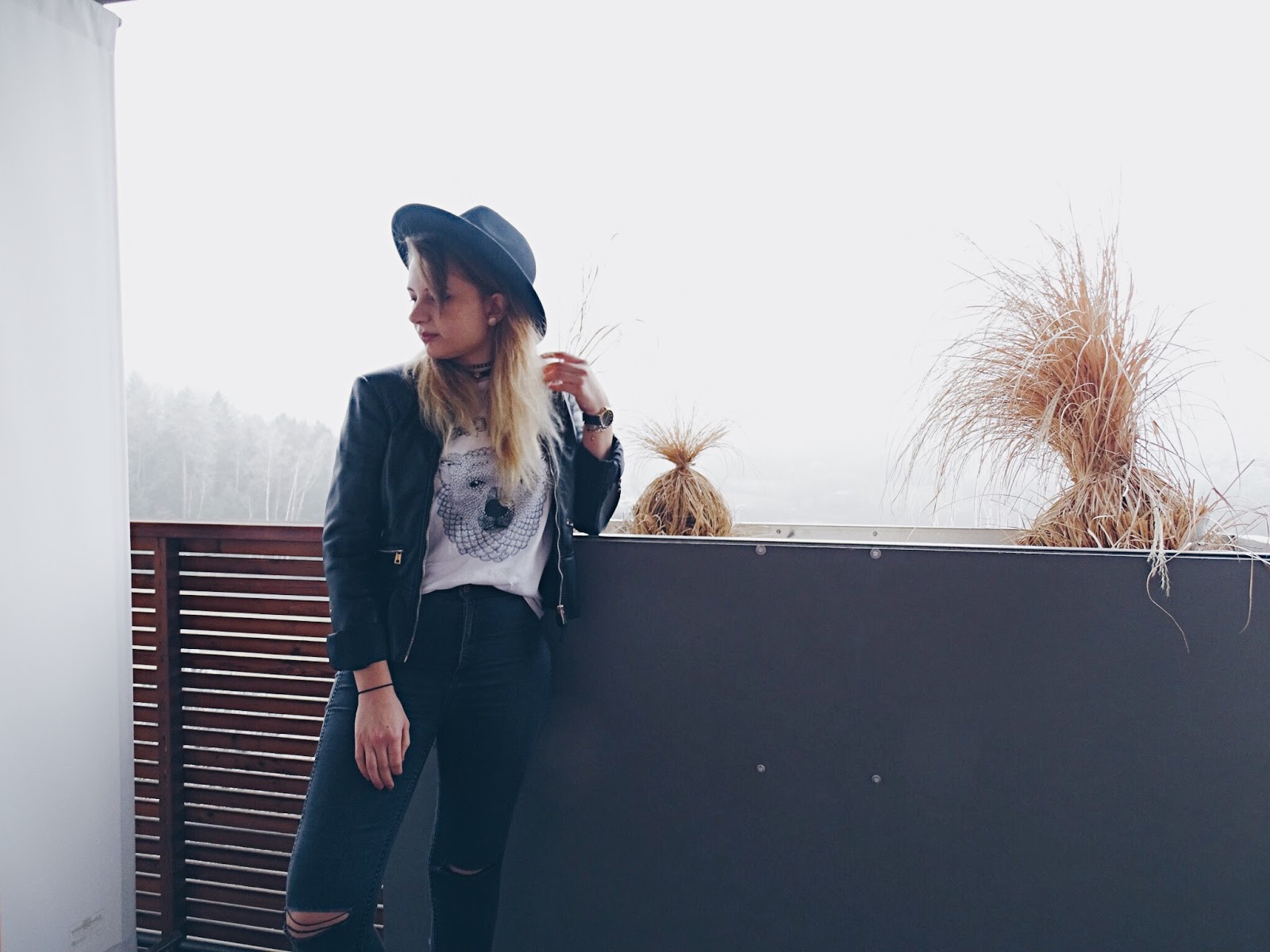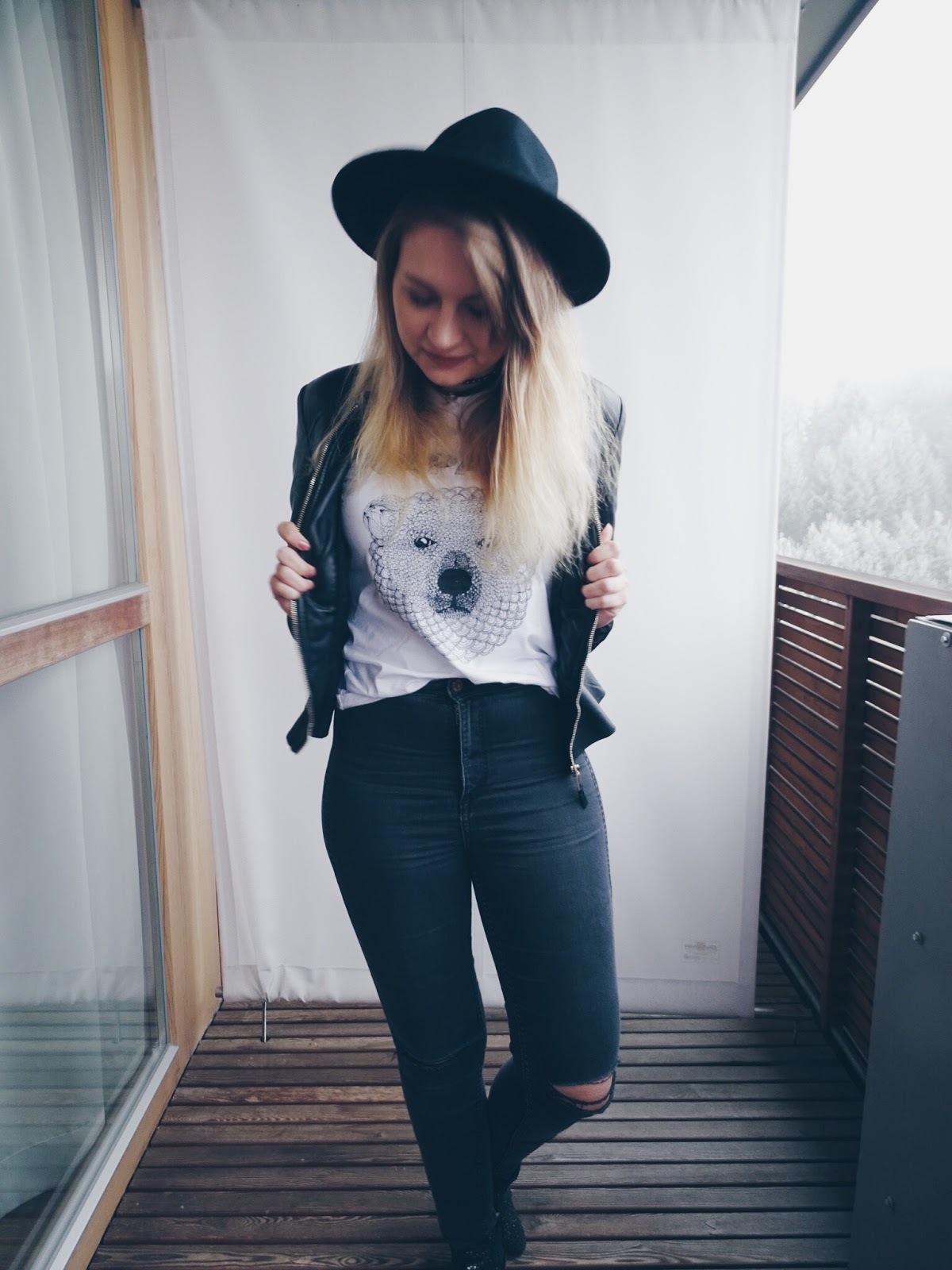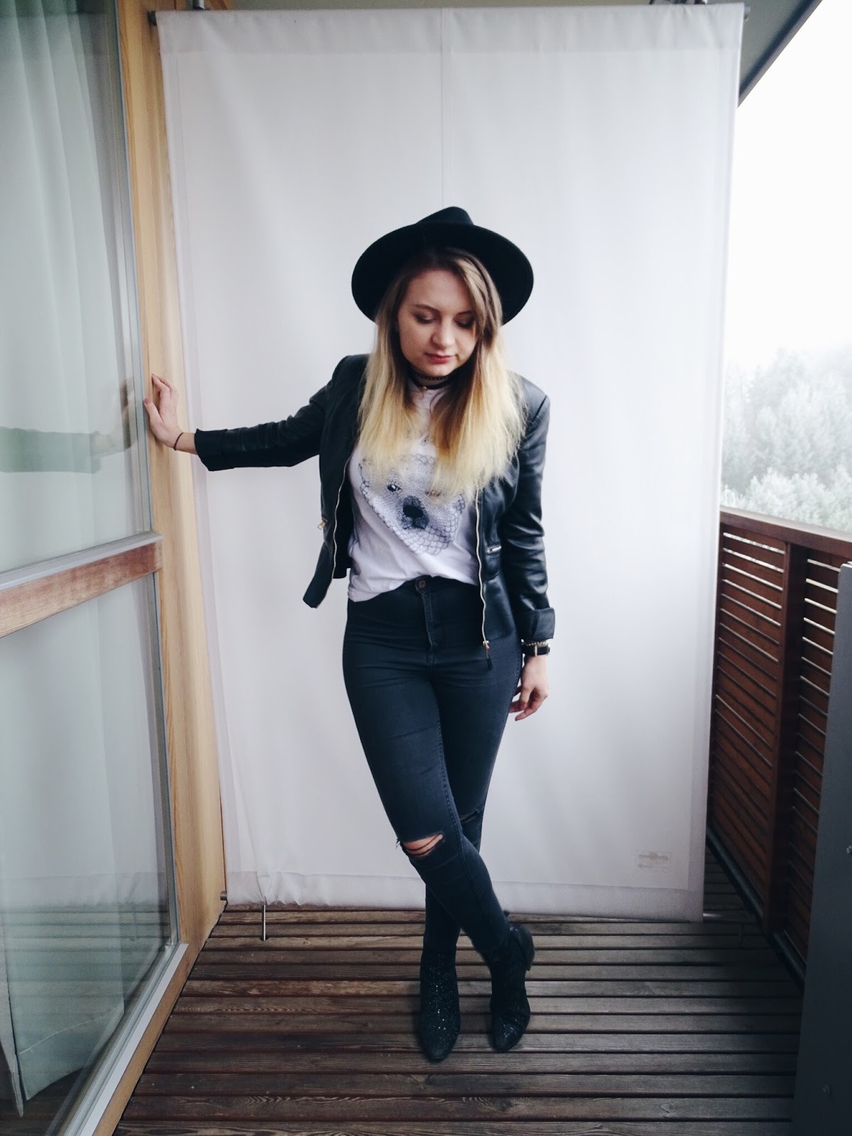 Jeans: H&M; Band T-shirt: NAPAEA; Leather Jacket: Zara; Hat: ASOS