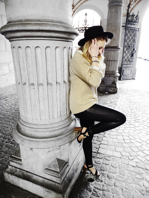 This time, I mixed up my brand new fedora with leather trousers, which definitely belong to the most comfortable piece of clothing I have ever purchased. The highlight of the outfit are the golden heeled shoes, which I purchased on ASOS as well. A little layering does the final touch to the outfit and makes it perfect for unpredictable spring weather. The camel coloured sweater, which I absolutely adore, is used as a replacement for a parka or a coat. Try not to combine leather trousers with any other leathery pieces as it might start to look a bit over the top and I highly advice you to take your time when looking for leather pants as they really have to fit perfectly to make a good look.