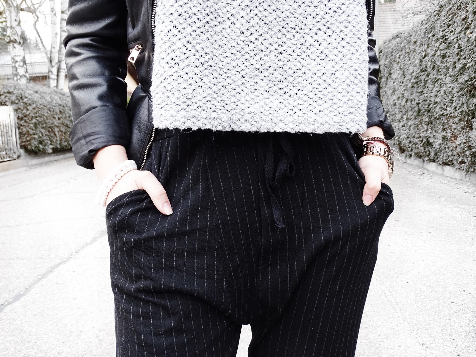 Spending holidays such as Easter at my parents’ place always makes me feel quite nostalgic which resembles the choices of my outfits. I tend to opt for comfortable and casual clothing a lot more than usual even though I have started to mix casual pieces with elegant pieces as my style has developed to being a lot more elegantly orientated. The casual trousers that may remind of sweatpants in terms of their shape are given an elegant touch by pinstripes covering the fabric. The comfortable combination of a simple, grey sweater and the trousers is a opposition to the laced heels but the pieces still don’t contradict themselves.