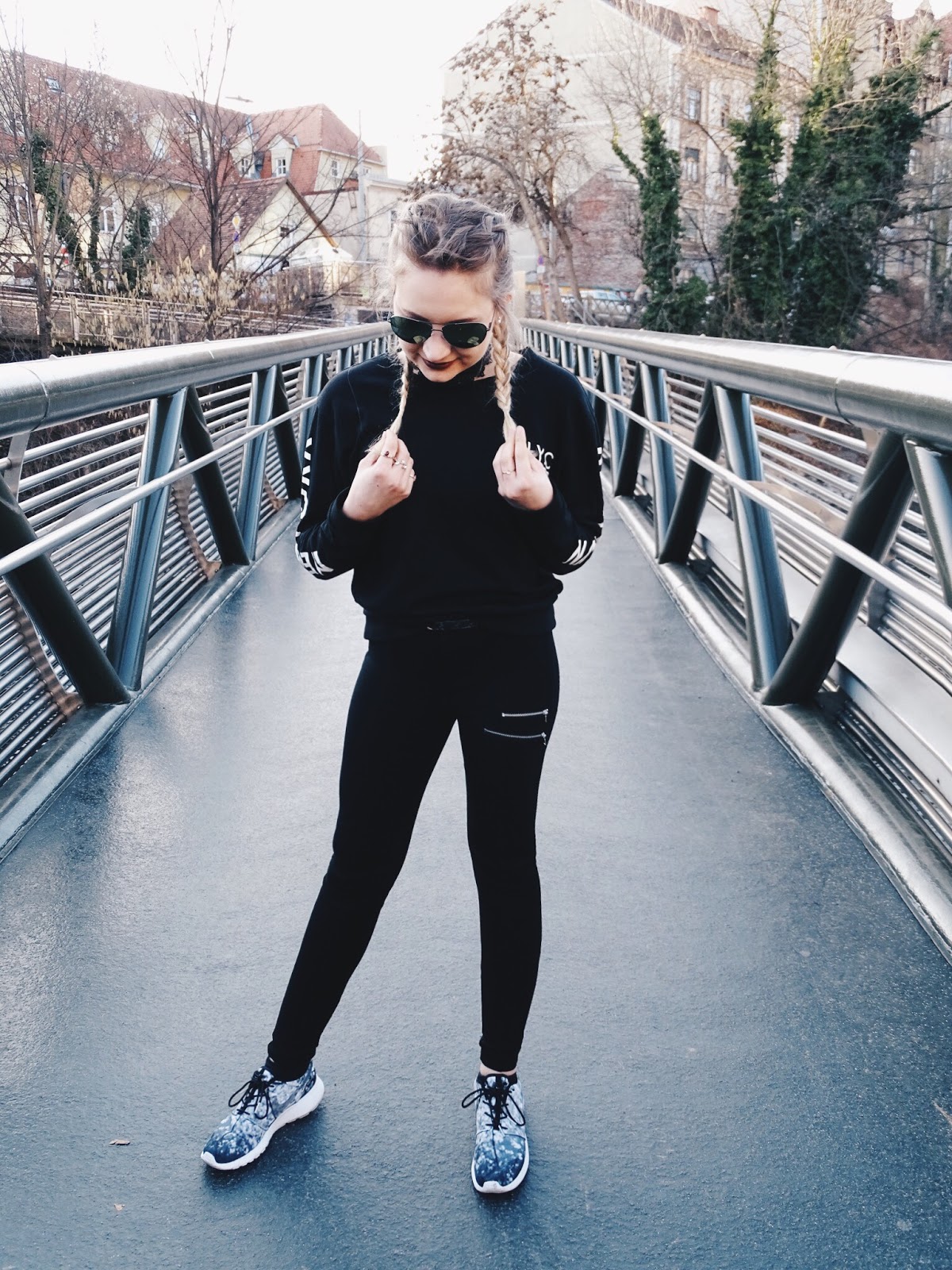 I still believe, however, that comfort mustn’t necessarily be connected to sweatpants. Chilled outfits can already be created by combining trousers in a soft, cozy fabric with an oversized sweater in a colour and fabric of choice. Finished off with a pair of sneakers that fit the colour scheme of the outfit, a relaxed every day look is achieved. A pair of boxer braids does the job of perfecting the laid back street style look and add an additional bit of comfort. (But, girls, let’s be honest, we mainly braid our hair to get those annoying strands out of the way.)